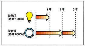 ランプの交換時期は、1日6時間点灯した場合、白熱灯で約1年、蛍光灯で約2年〜3年が目安です。 |