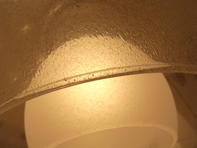 特にフロスト加工(表面がざらざらとしたすりガラス/曇りガラス様のもの)は油分の付着が非常に目立ちます。手の脂等と違って落ち難く、照明の魅力を損なってしまいますので、注意が必要です。